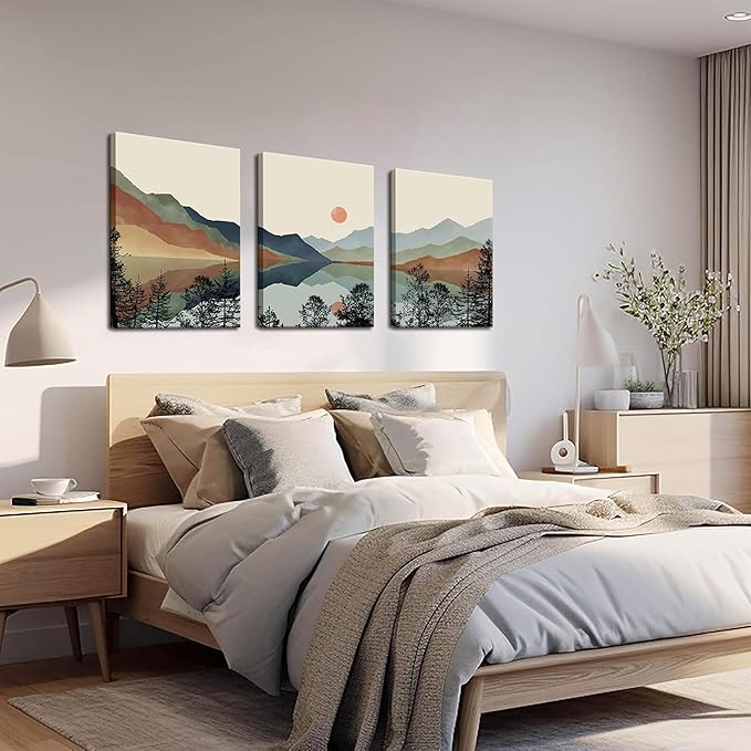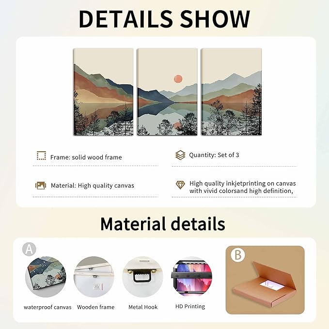 <ul class="a-unordered-list a-vertical a-spacing-mini"> <li class="a-spacing-mini"><span class="a-list-item">【Mountain Wall Art】: Step into serene landscapes with our set of 3 Boho Sun Forest watercolor paintings. This mountain canvas wall art beautifully captures the sun-kissed mountains and forest in abstract nature-themed artwork, bringing a sense of peace and tranquility to any space.</span></li> <li class="a-spacing-mini"><span class="a-list-item">【Easy Installation】: Arriving in a set of 3 Size 12x16, these nature wall art pieces are skillfully framed and ready to hang. They will create a harmonious environment in your living room, bedroom, or office, saving you the hassle of framing and hanging separately.</span></li> <li class="a-spacing-mini"><span class="a-list-item">【High-quality Prints】: Crafted with high-quality canvas, these mountain wall decor pieces offer clear, vibrant, and long-lasting colors. Each art print is framed to ensure a perfect presentation of the artwork, making them suitable for modern wall decor or boho art aesthetics.</span></li> <li class="a-spacing-mini"><span class="a-list-item">【Versatile Wall Decor】: Whether it’s your living room, bedroom, or office, these landscape art pieces are versatile and can be arranged according to your preference. They make an excellent choice for modern, boho, or forest-themed decor, enhancing the aesthetic appeal of any room.</span></li> <li class="a-spacing-mini"><span class="a-list-item">【Ideal Gift Idea】: Framed and ready to hang, these nature canvas wall art prints are an ideal gift for art lovers, friends, or family members. Whether it’s a housewarming, birthday, or special occasion, these boho framed wall art pieces serve as thoughtful and artistic presents.</span></li> </ul>