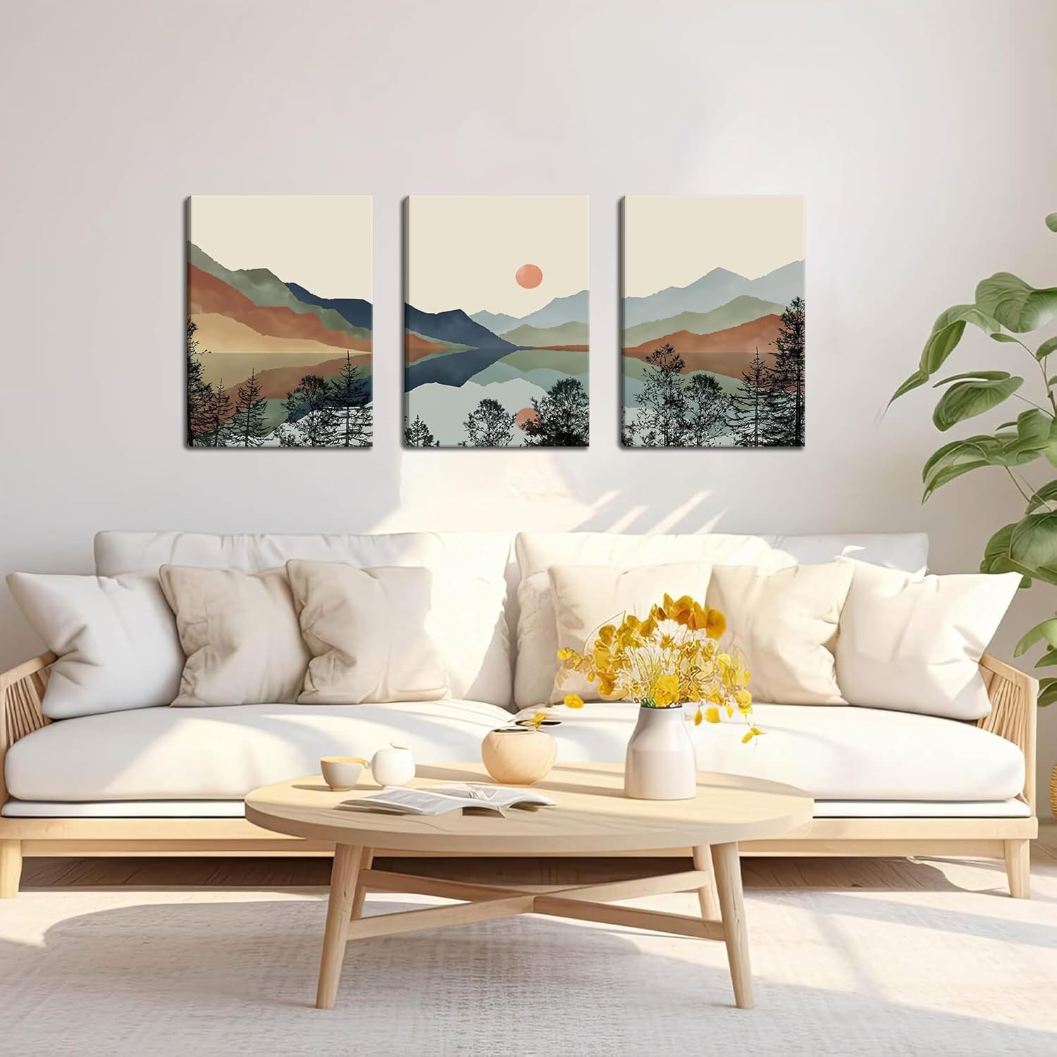 AKWISH Framed Mountain Canvas Wall Art Set of 3, Boho Watercolor Poster Prints Painting