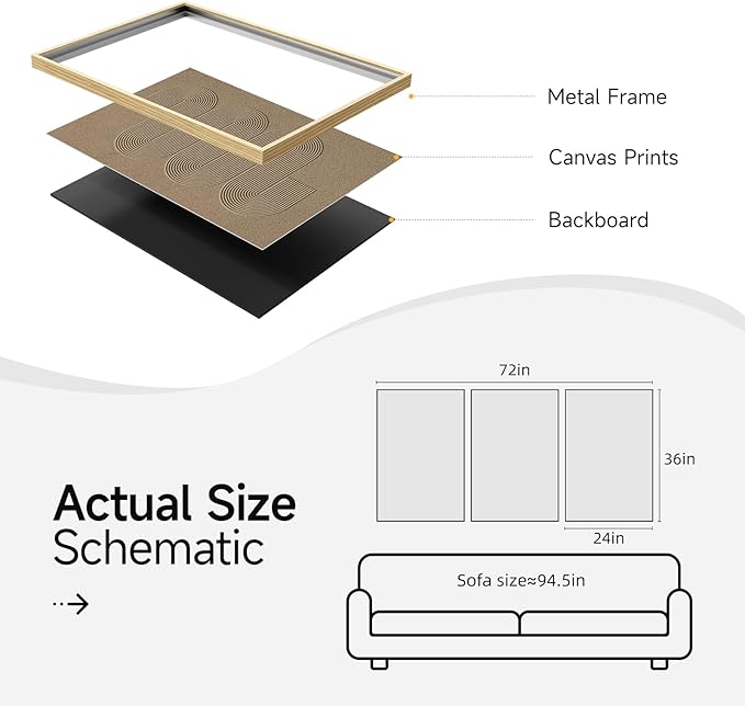<li class="a-spacing-mini"><span class="a-list-item">[Framed Wall art]: A set of 3 large contemporary minimalist brown black and white abstract wall art each 24x36 inches, 3 pieces totaling 36" H x 72" W. Each Painting with a sturdy, rust-proof frame</span></li>