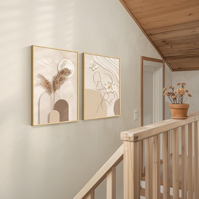 <li class="a-spacing-mini"><span class="a-list-item">[Neutral Wall Art]: The two paintings mainly use beige, light tan and cream, and the overall neutral tone is very soft, giving people a feeling of peace and harmony. In the painting on the left, the combination of the moon and dried flowers creates a natural and mysterious atmosphere, and in the painting on the right, the simple lines of the human outline and the design of flowers have a kind of abstract art aesthetic. Very suitable for decorating the living room, bedroom, dining room, study or bathroom and other scenes, can create a warm and comfortable atmosphere</span></li>